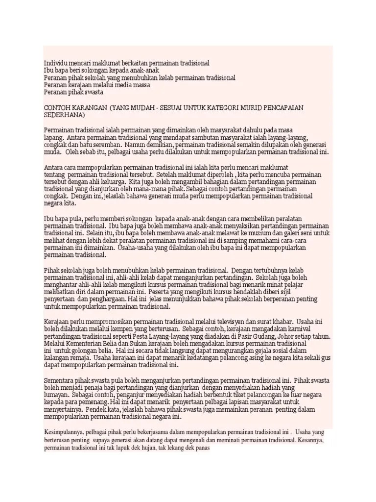 Ni esei berape patah perkataan die. Usaha pertama yang saya lakukan untuk memartabatkan permainan tradisional adalah dengan memupuk minat diri sendiri terhadap permainan tradisional. Alat permainan tradisional juga merupakan satu seni budaya yang amat unik dan terunggul. Oleh hal yang demikian, permainan tradisional seperti congkak, guli, wau, gasing dan tingting memainkan peranan yang penting dalam mengisi masa lapang para . Faktor permainan tradisional semakin dilupakan englshsime. Tulis karangan ini dengan panjangnya melebihi 350 patah perkataan.